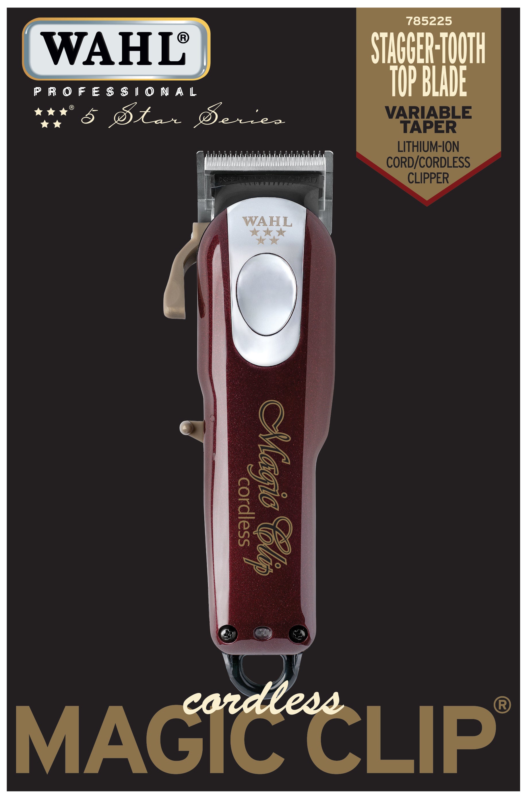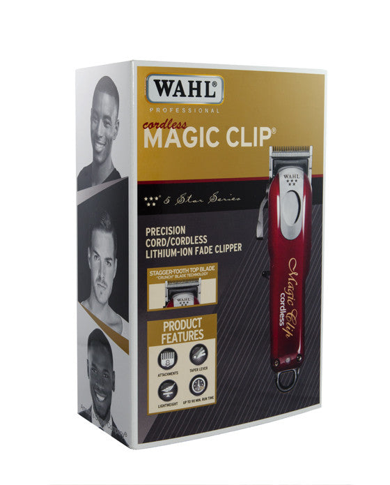 Wahl's Magic Clip is amongst the industry's favourite cordless electric razors, renowned for its powerful rotary motor. Cord /Cordless operation. Lithium is more durable and longer lasting than standard NiMH battery chemistry. Contains specialty cells providing higher current, for more power and torque. Powerful and durable rotary motor. 90 minutes run time with a 2-hour charge time. The magic is in the blade! Features a new "STAGGER-TOOTH" blade with "CRUNCH" blade technology for a smoother and faster cut. Alternating cutting paths: Stagger-tooth blade features tall square teeth alternating with small teeth in between, combined with the enhanced taper lever, making a longer throw for more efficient cutting. Tackles larger, denser amounts of hair at one time without bogging down or pulling. Adjustable lever varies the taper and texture of the cut without changing the blade. Ideal for precision fades and blends. Lightweight and sleek ergonomic design. Worldwide voltage.