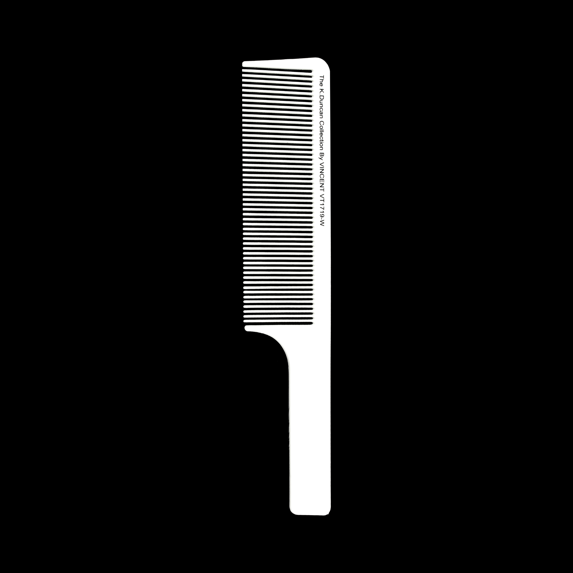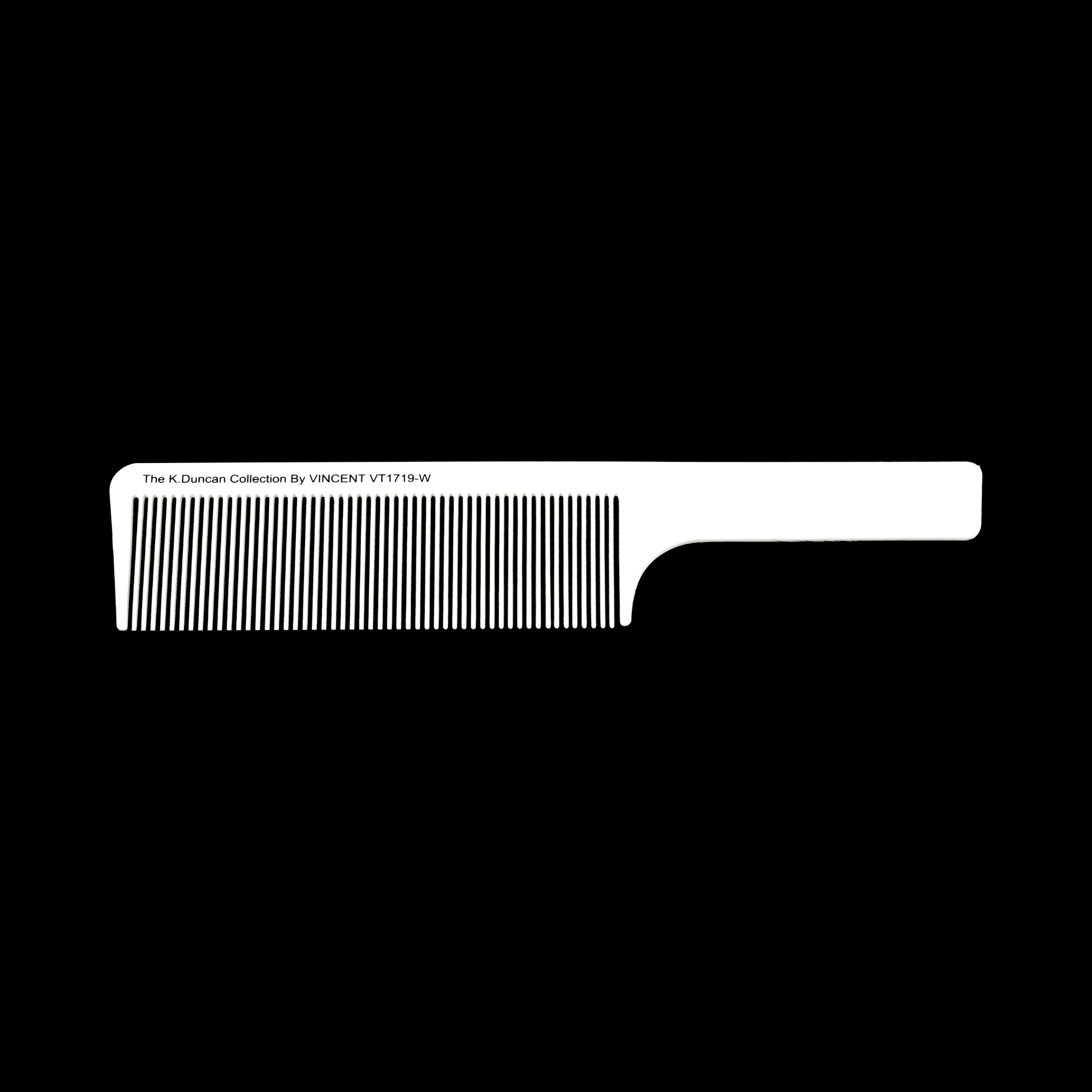 Presenting the Flat Top Comb 9" - a collaboration with Kenny Duncan. Crafted with white carbon, these combs are perfect for dark or color-treated hair. Offering enhanced visibility, they are static-free, chemical-resistant, and compatible with sterilizers. The rounded teeth ensure gentle detangling, while their heat resistance of up to 428 °F guarantees durability during heat styling.