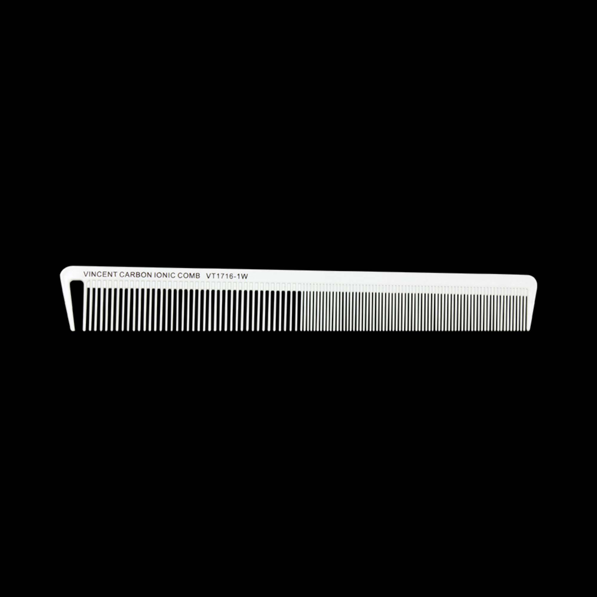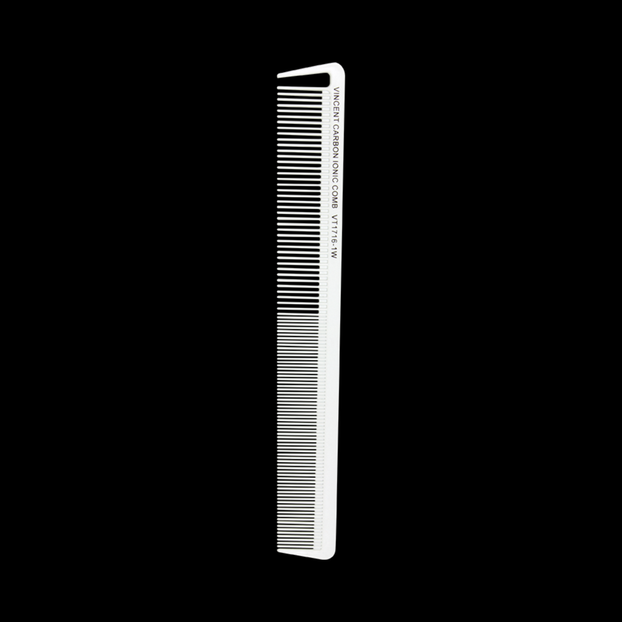 Introducing the Ceramic White Hook Comb 8.5" - a collaboration with Kenny Duncan. These combs, crafted with white carbon, are perfect for dark or color-treated hair. Their high visibility ensures precise styling, while being static-free, chemical-resistant, and sterilizer compatible. With rounded teeth and heat resistance up to 428°F, they offer superior performance and durability.