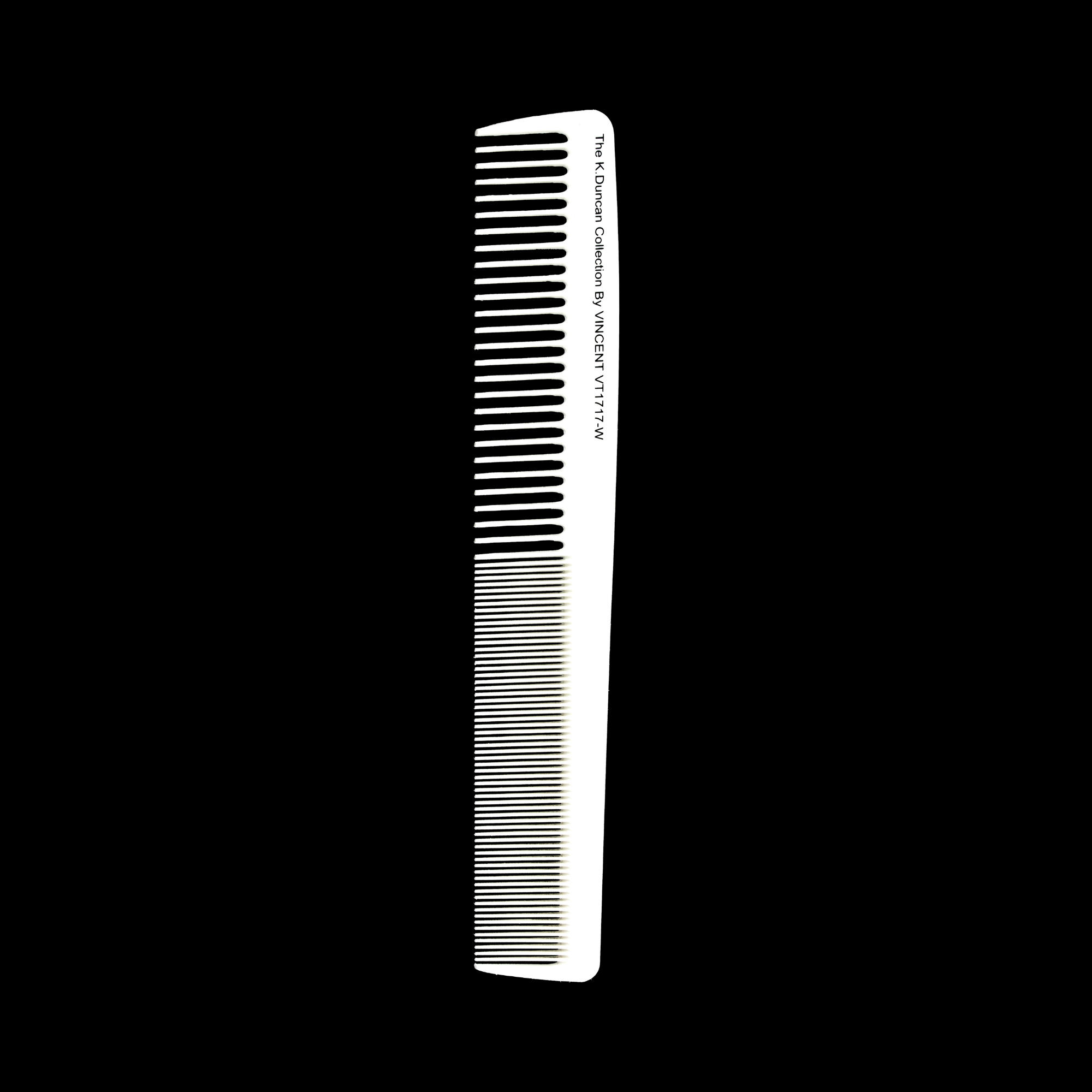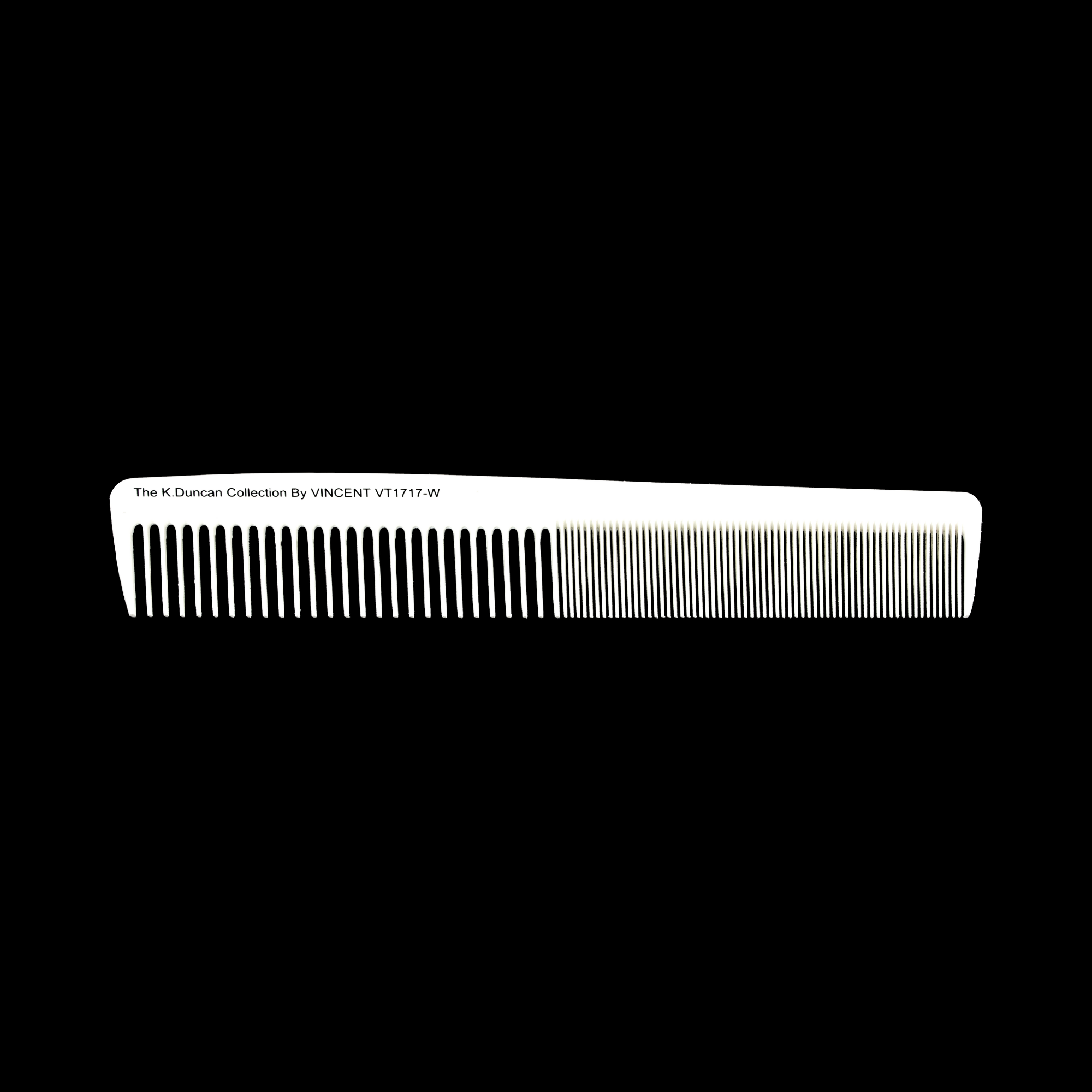 Presenting the Ceramic White Marceling Comb - 8.75", a collaboration with Kenny Duncan. Crafted with white carbon, these combs are perfect for dark or color-treated hair, providing enhanced visibility. Enjoy static-free, chemical-resistant, and sterilizer-compatible qualities for effortless styling. The comb features rounded teeth and is heat-resistant up to 428°F, ensuring reliable performance for all your styling needs.