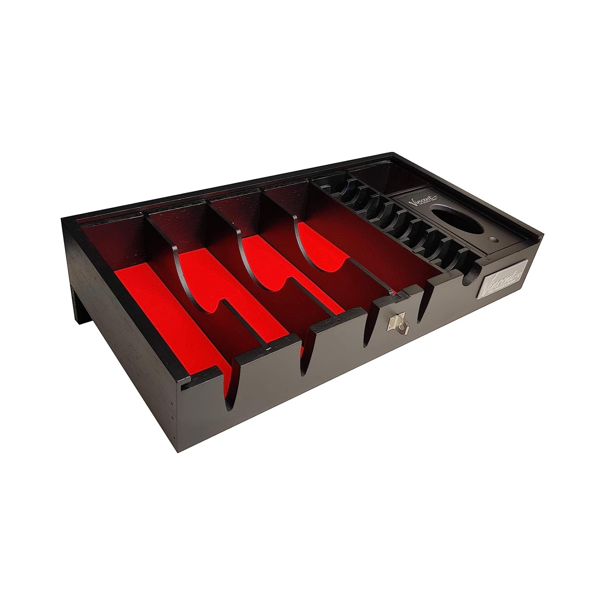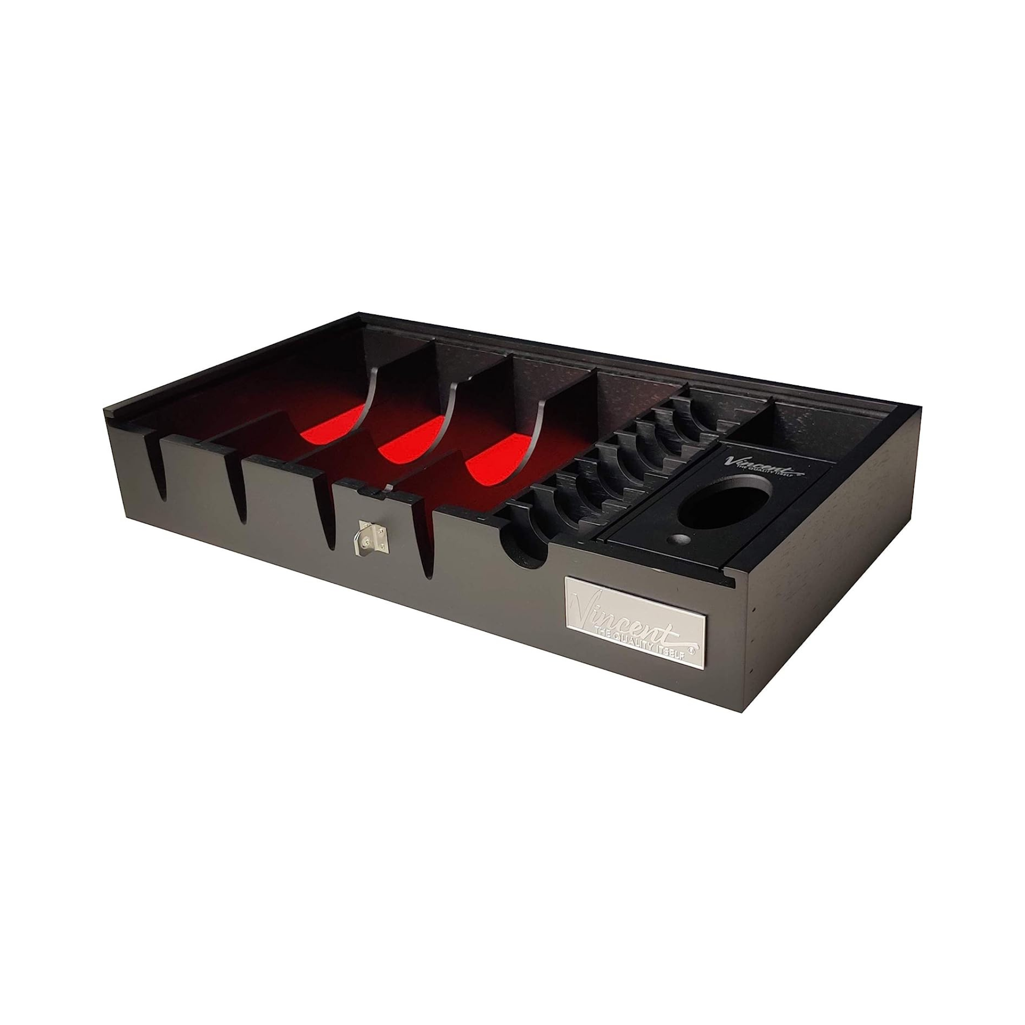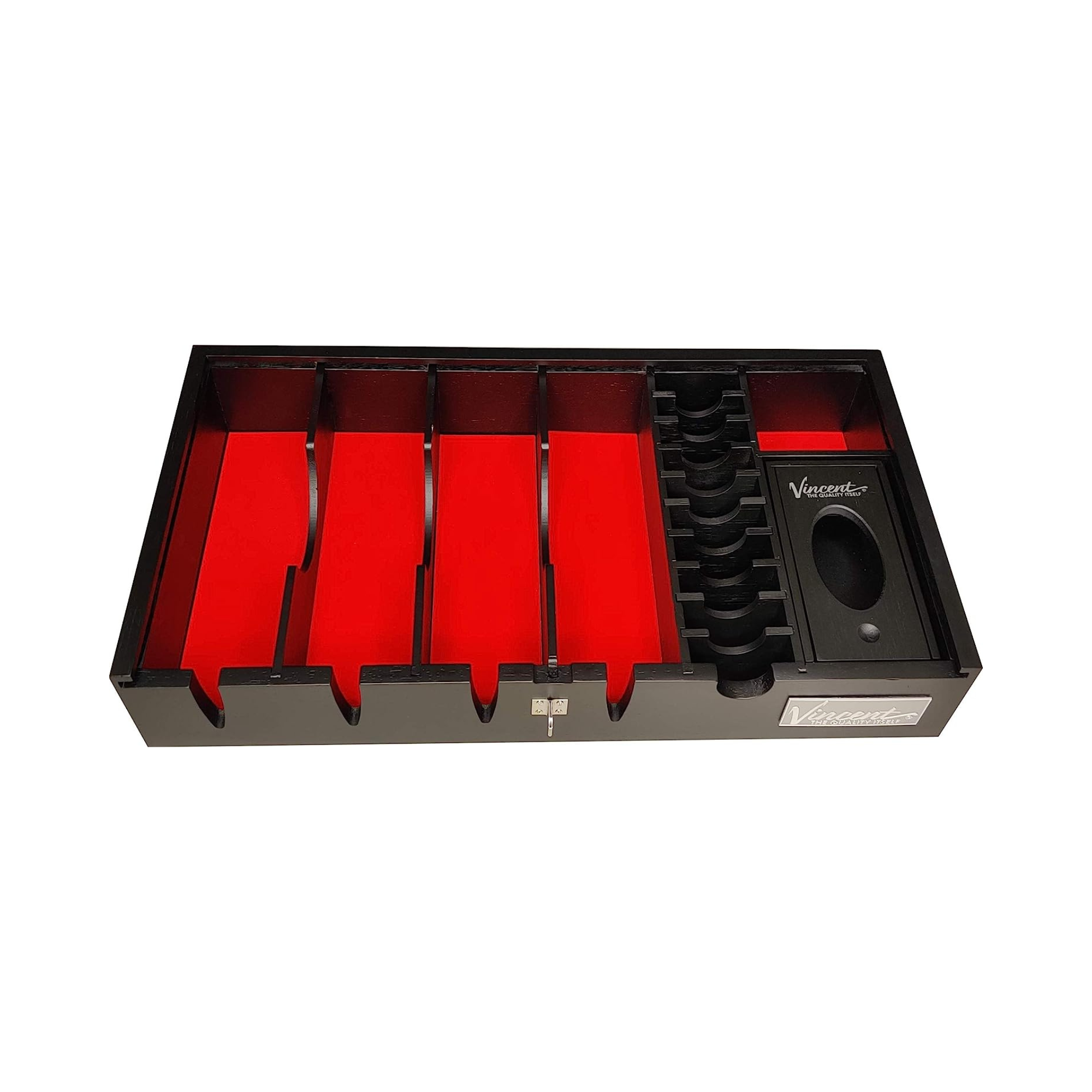 Introducing the compact Counter Top Tray 6, a must-have for barbers. Measuring 19" x 11" x 3" and weighing 5.5 lbs., it offers 4 tall compartments with strong dividers for clippers, removable neck strip dispensers, and guide slots. The slide-out lid provides easy access and protects tools from dust particles, ensuring their longevity. Maximize your tool storage with the Counter Top Tray 6!