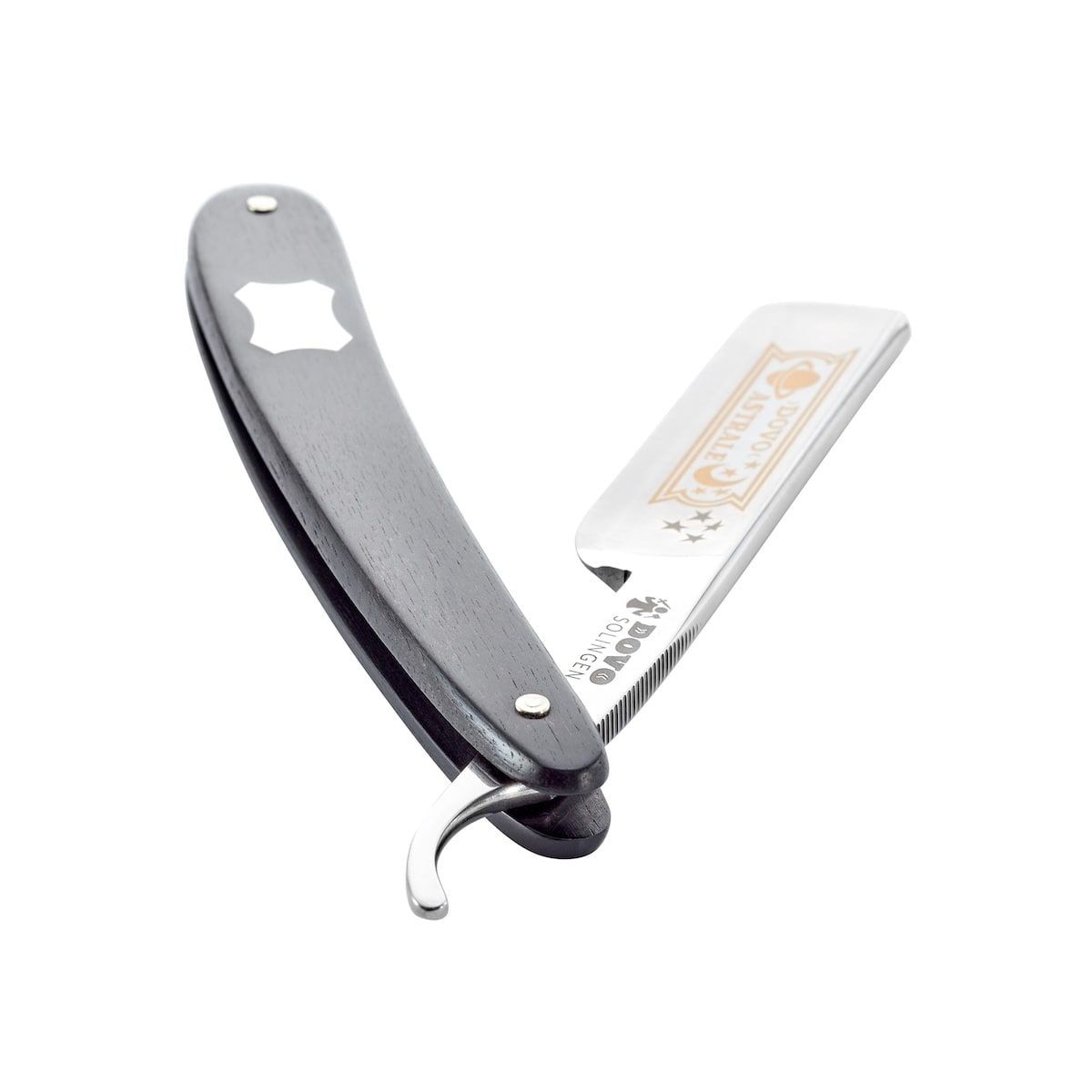 Reach for the stars with the DOVO straight razor! Thanks to the semi-hollow cut, double-fluted tang and real gold decoration, the ASTRALE takes you on an exciting journey into the galaxy of classic wet shaving. You are welcome to engrave your personal start date on the inserted nickel silver plate in the ebony handle.