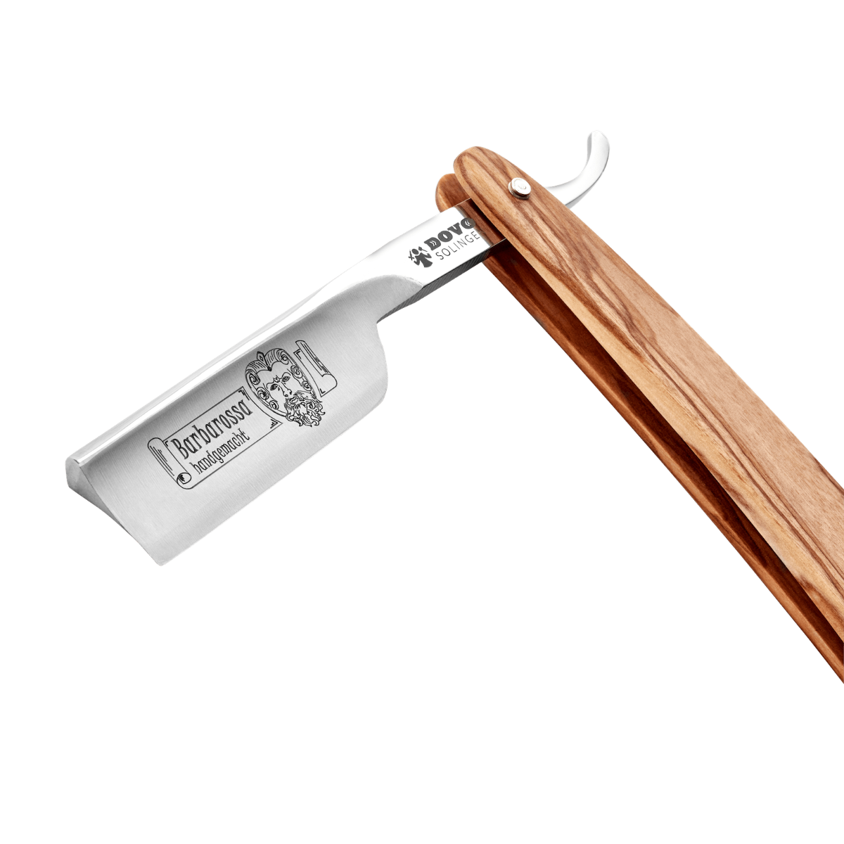 Its standout feature is the engraving of Emperor Barbarossa, a nod to timeless grooming tradition. Paired with a beautifully grained olive wood handle, it offers both elegance and ergonomic comfort in the hand.