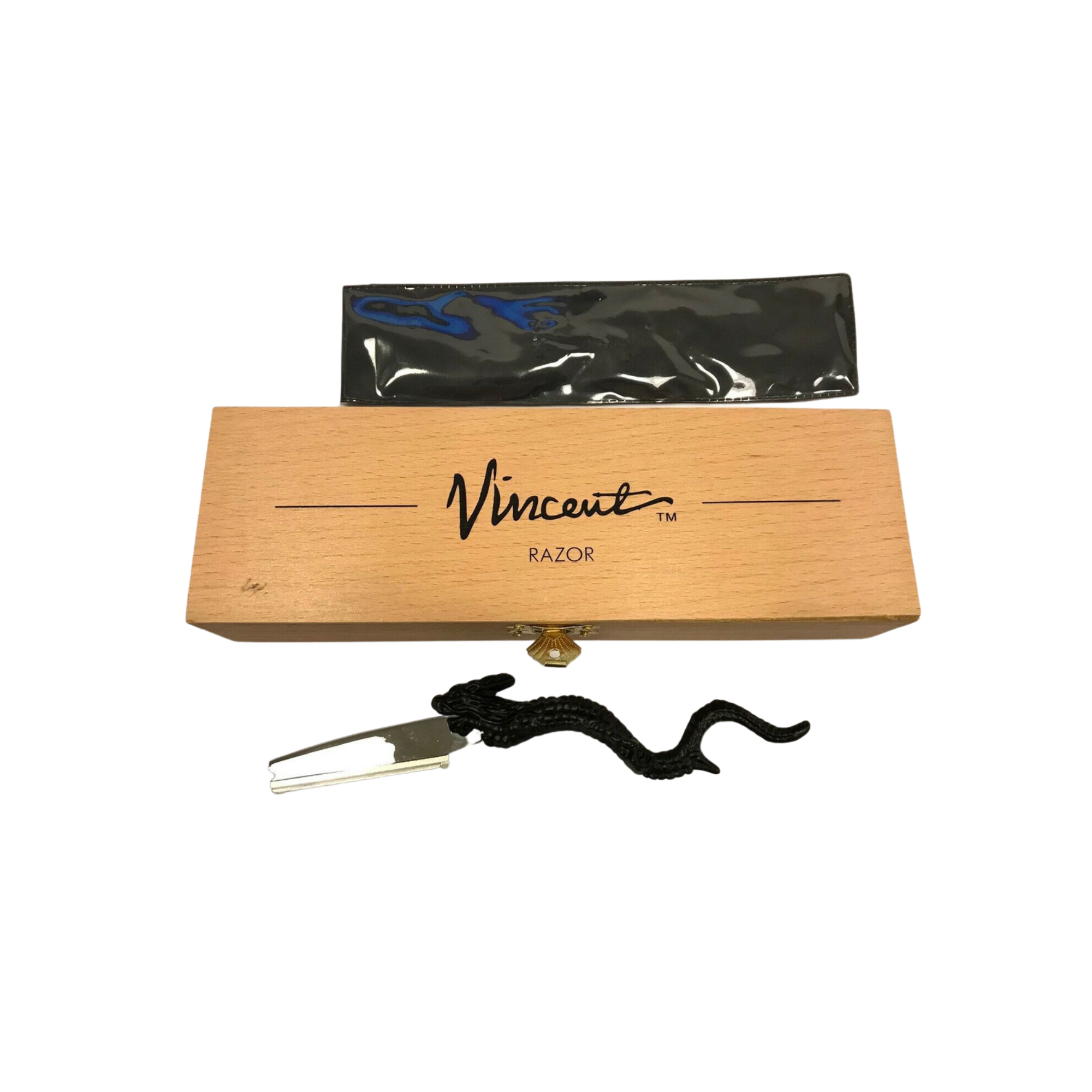 Introducing the Dragon Hair Trim Razor VT303-1. Its captivating dragon design enhances the stainless steel body, providing rust and tarnish resistance. The razor employs Vincent 58mm shaper blades (VT303B) or 58mm double edge blades (VT302B), ensuring precise and effortless hair trimming. Unleash your grooming prowess with this unique dragon-inspired razor.