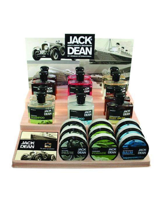 The Jack Dean Counter Top Unit displays the finest men's products. Containing two bottles of each shampoo and hair tonic, this all-encompassing display provokes intrigue for all needs. With the presentation of the Bay Rum Body Wash, the Aftershave Balm, the Styling Paste, and Pomade, men everywhere will know all their needs will be met with Jack Dean for every occasion. Made in the UK.