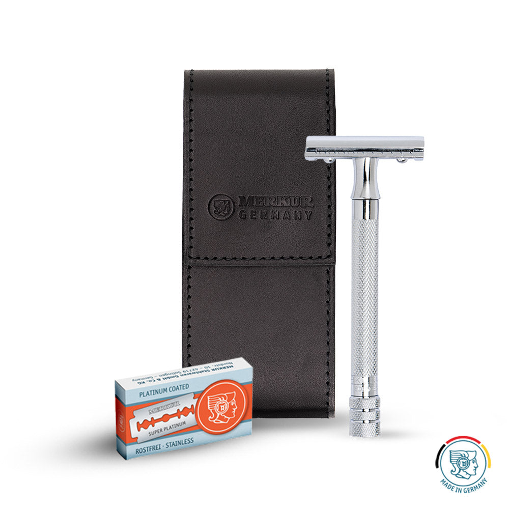 Experience unparalleled grooming luxury with the Merkur Leather Case filled with the Merkur 23001 safety razor and 10 blades. This exquisite set combines superior craftsmanship, functionality, and style to elevate your shaving routine to new heights.