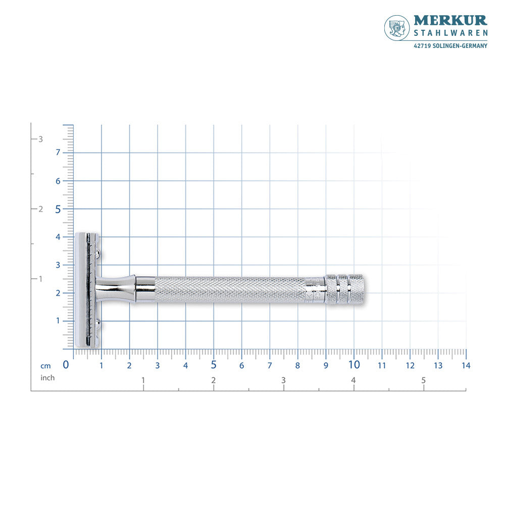 - 1 Merkur 23001 safety razor with a brass handle and die-casted zinc razor head