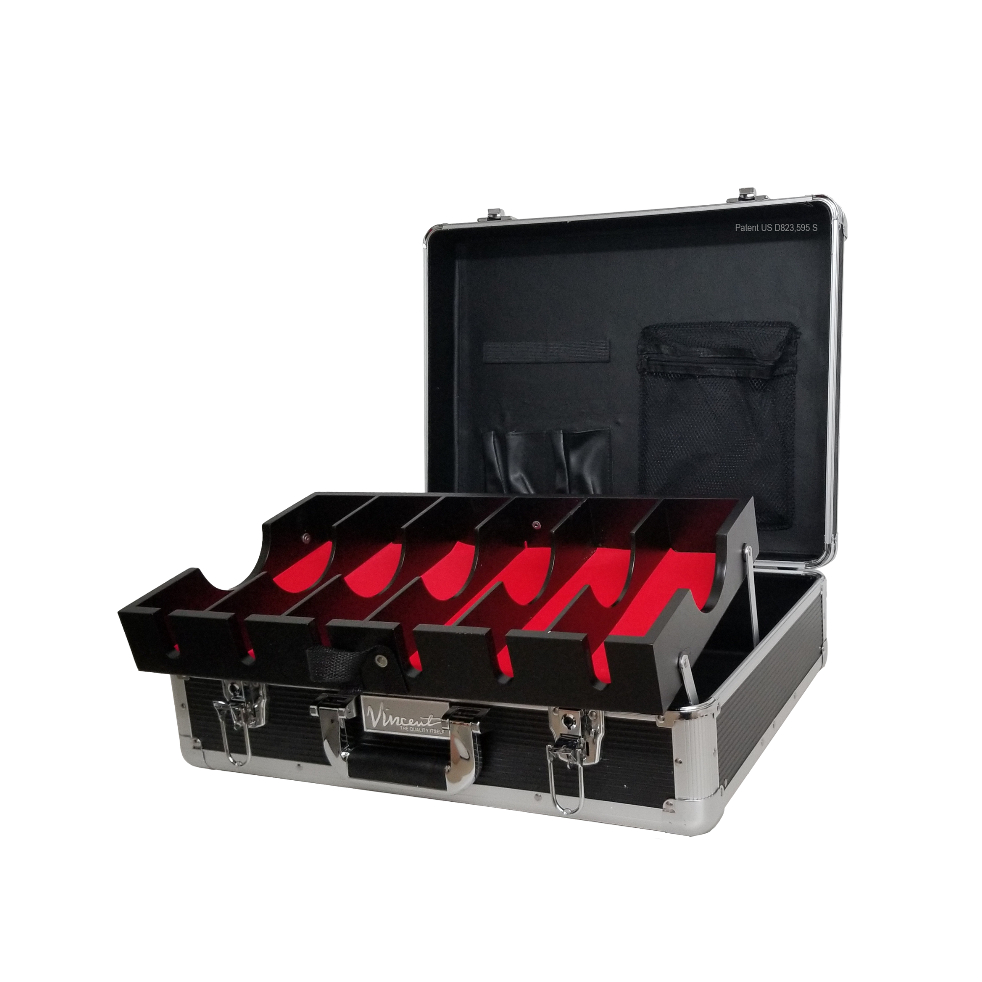 Introducing the Premium MASTERCASE LARGE in BLACK, a professional's dream companion. This 19.25" x 6.25" x 15" briefcase-style case weighs only 10 lbs. It offers a hard back design, a removable compartment, and an elevating and tilting clipper tray with red fabric lining. Designed for on-location work, it provides easy cleanup to safeguard and maintain pristine tools. Elevate your professionalism with the Premium MASTERCASE LARGE!