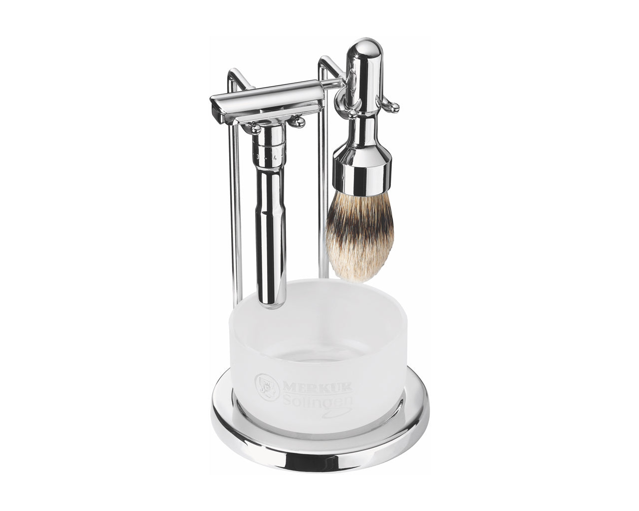 Merkur 4751 exclusive stands for the Future 701 shaving series. Solid base plate with space for the glass shaving bowl, carrying two hooks each for the razor and the brush. This set brings order into your bathroom and presents like a showcase your unique shaving accessory.