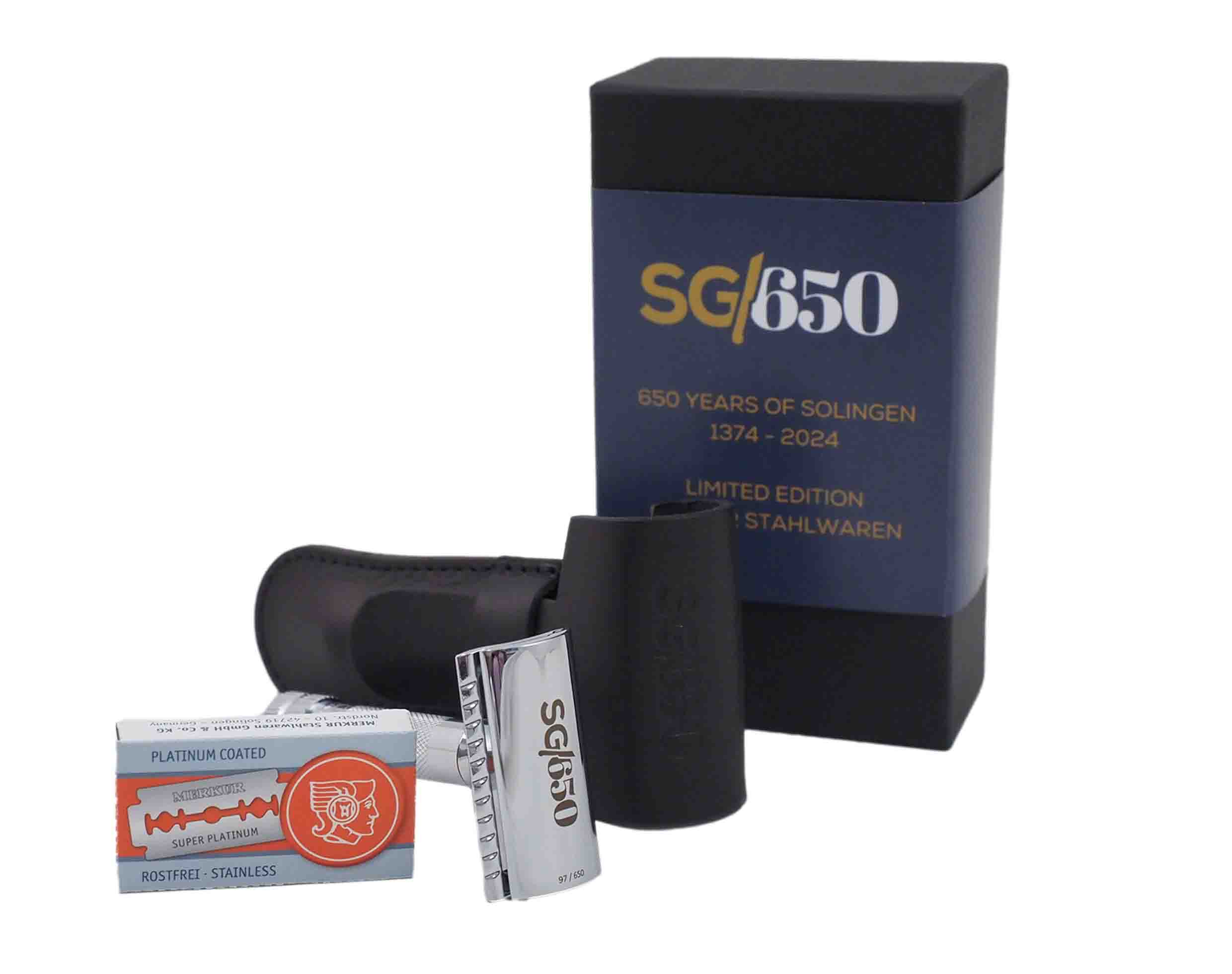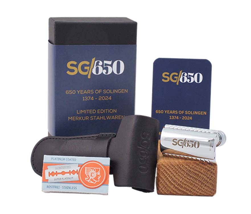 Celebrate the 650th anniversary of Solingen, the blade city, with the Merkur DE Razor 34C Limited Edition. This exclusive collector's set features a two-piece, straight-cut razor, numbered from 1-650. The set includes a beautifully embossed leather case, 10 razor blades, and a certificate, all presented in a high-quality gift box. Crafted in Germany with a bright chrome finish, this limited edition razor is a must-have for any safety razor enthusiast.