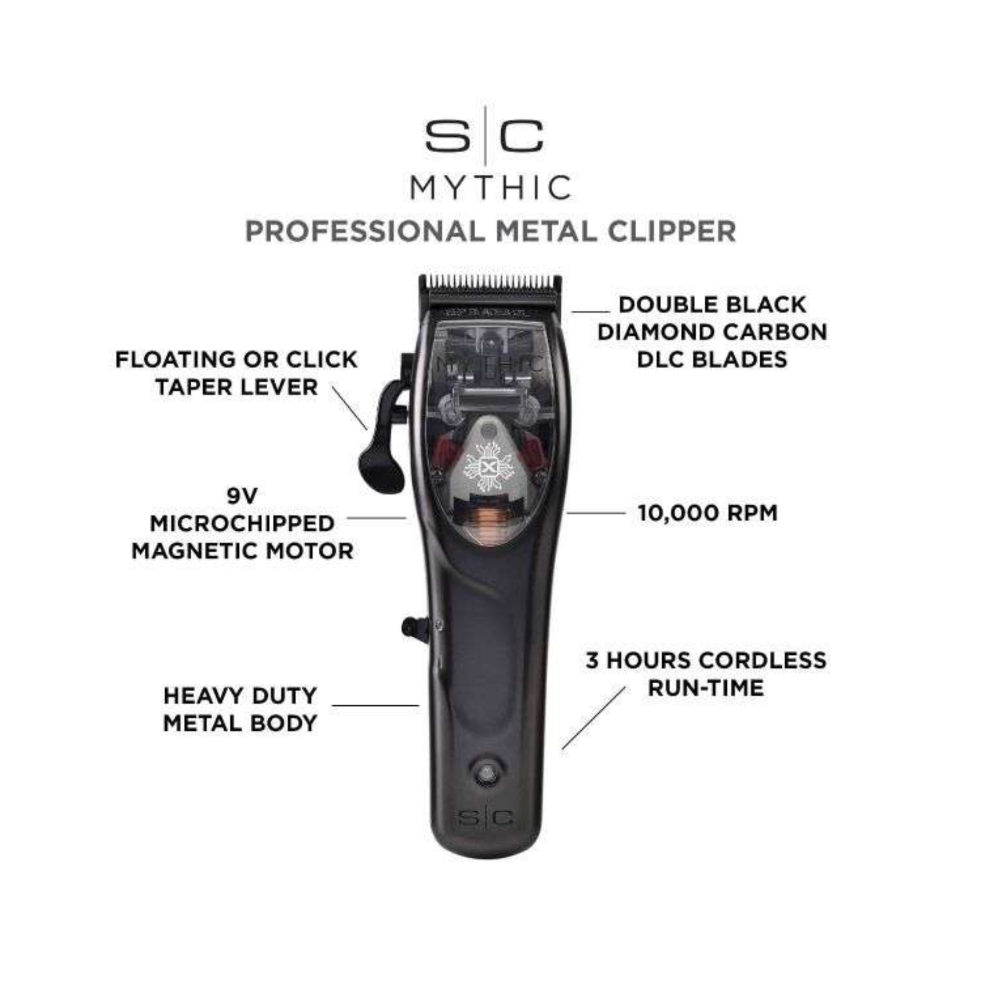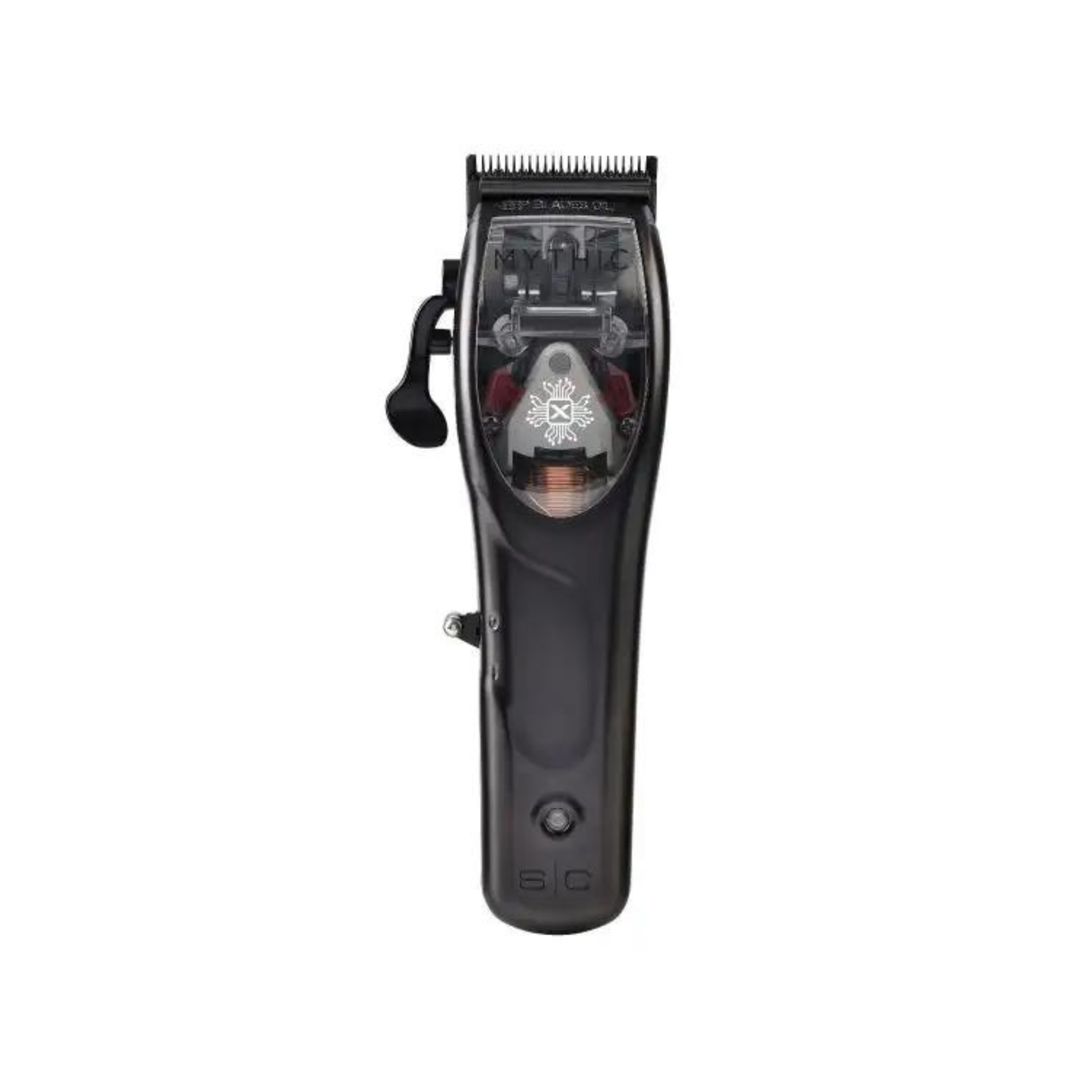 Double Black Diamond Carbon DLC Fixed Blade: Assembled with a Double Black Diamond Carbon DLC fixed blade featuring a shallow tooth cutter, the Mythic clipper ensures superior blending, fading, and bulk removal.