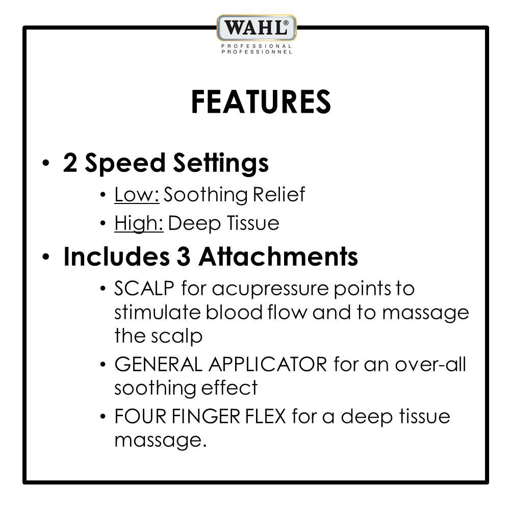 2 Speed settings to provide fast relief. Low: Soothing Relief. High: Deep Tissue. 3 Attachments to customize the massage experience: SCALP for acupressure points to stimulate blood flow and to massage the scalp, GENERAL APPLICATOR for an over-all soothing effect & FOUR FINGER FLEX for a deep tissue massage. The most powerful massager, light in weight and quiet for a great massage. Ergonomic design. Corded massager for maximum power. Includes convenient hang hook.