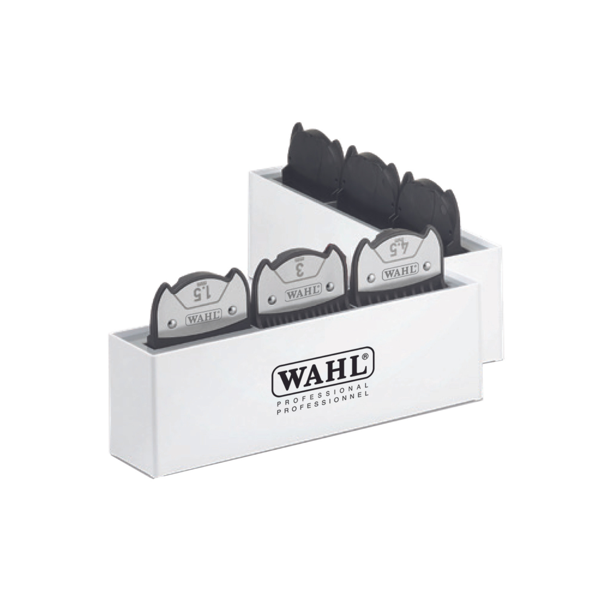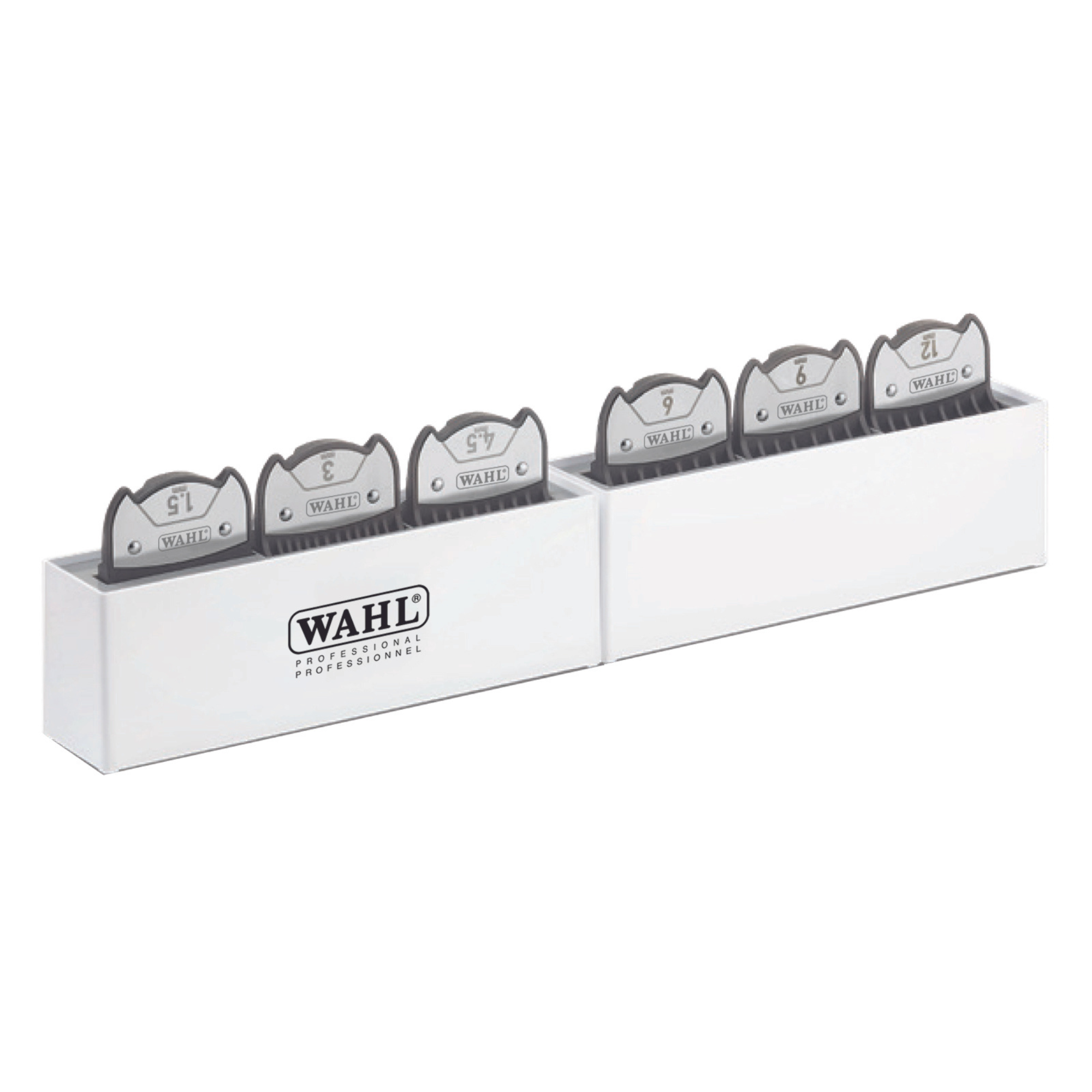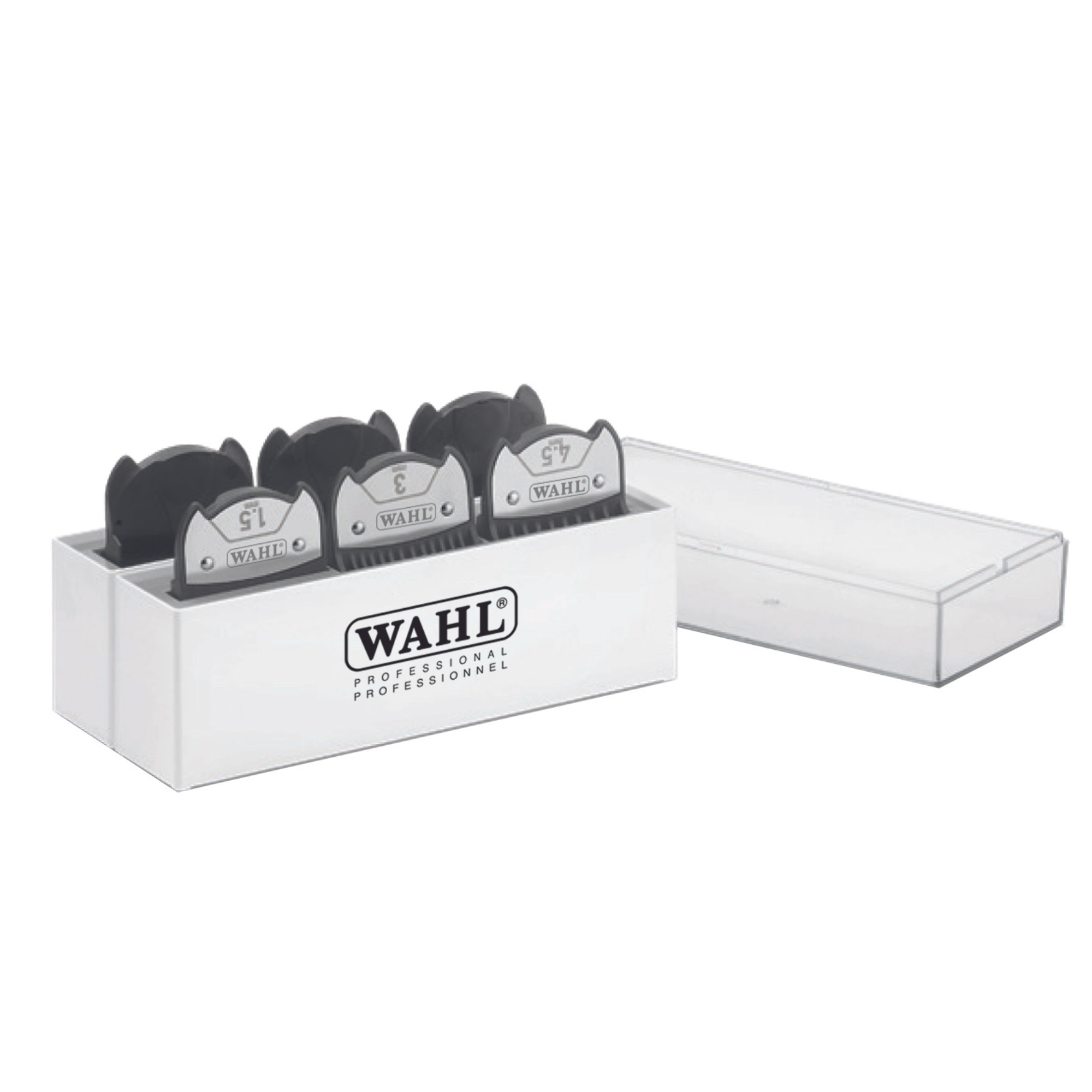 Elevate your grooming game with the Wahl Storage Box featuring Magnetic Premium Attachment Combs. This comprehensive kit includes six magnetic premium guide combs designed for a perfect fit with the MAGCLICK System. The MAGCLICK technology ensures a secure attachment to the blade set, confirmed with a satisfying click sound, providing confidence in every grooming session.